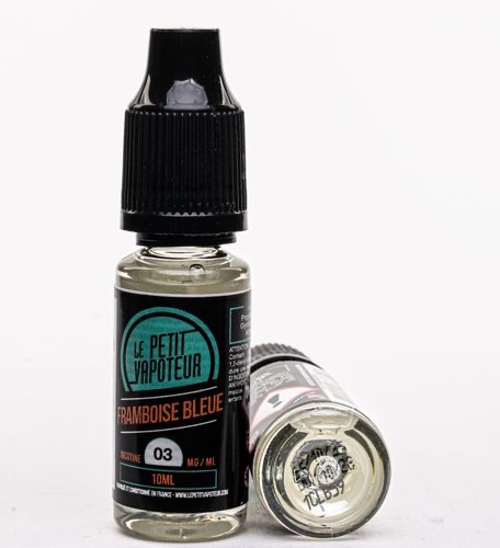 - E-liquide LE PETIT VAPOTEUR - Framboise Bleue - Nicotine : 3mg/mL - 10 mL - PG : 60 / VG : 40 Numéro de lot : 1CLB59 Date de durabilité minimale : 10/28