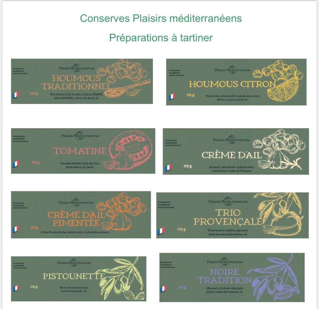 - Tomatine, noir tradition, pistounette, crème d’ail, crème d’ail pimentée, houmous traditionnel, houmous citron