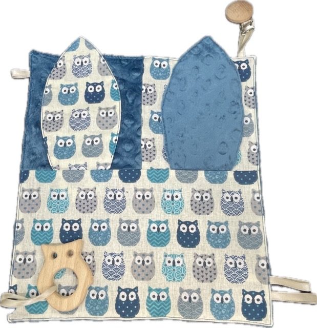 - Doudou plat avec ajout d'un attache en bois et d'un ajout en bois.