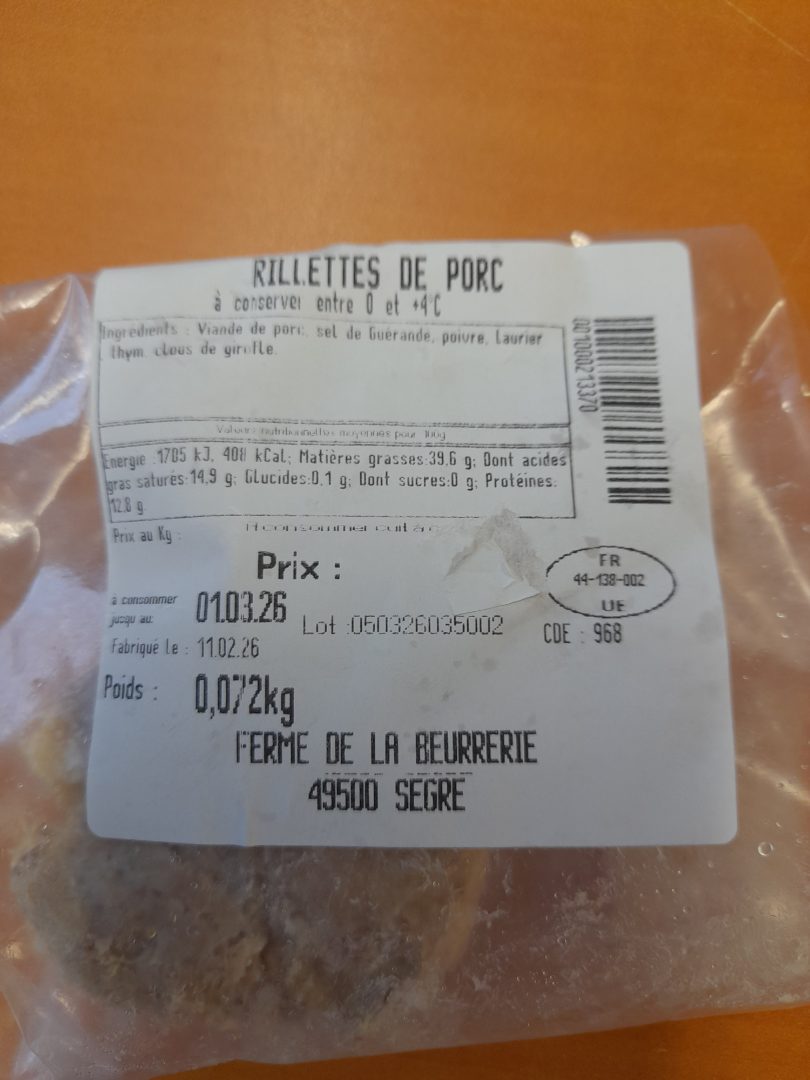 Pas d'enseigne, les rillettes sont fabriquées pour la ferme de la Beurrerie qui les vend ensuite à ses clients (prestataire de service pour eux)