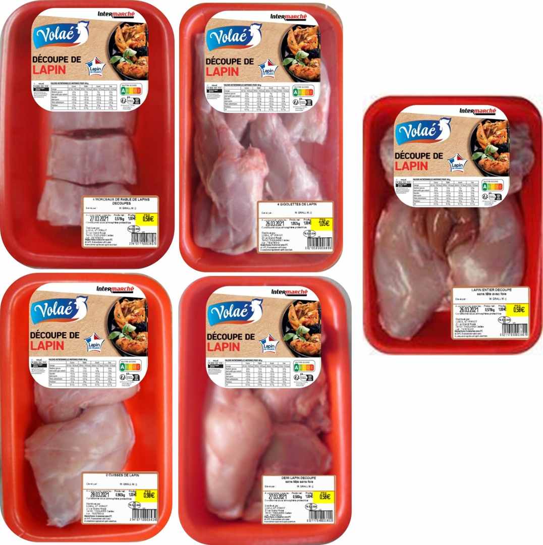 - LAPIN ENTIER DÉCOUPÉ SANS TÊTE AVEC FOIE, 4 GIGOLETTES DE LAPIN, 2 CUISSES DE LAPIN, DEMI-LAPIN DÉCOUPÉ SANS TÊTE AVEC FOIE, 4 MORCEAUX DE RÂBLE DE LAPINS DÉCOUPÉS