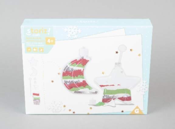 Boite en carton avec en photo une étoile et une lune contenant du sable