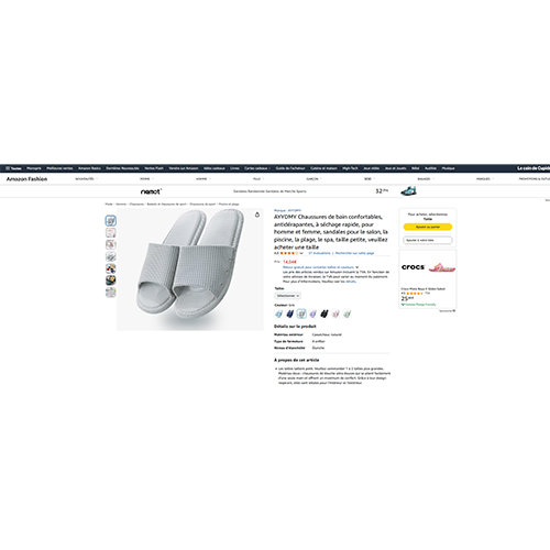 - Chaussures de bain confortables,chaussons antidérapants à séchage rapide pour hommes et femme Pantoufles de douche. Produit vendu en ligne, notamment via Amazon (ASIN: B0C5ZKVY92).