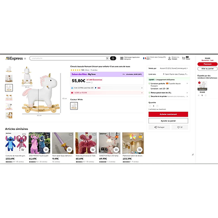 - Cheval à bascule Jouet doux en forme de licorne avec une structure en bois, adapté à une utilisation comme cheval à bascule, équipé d'un système de sonorisation à batterie. Produit vendu en ligne, notamment via AliExpress (identifiant unique du produit: 1005007463472571), Amazon et Maisons du Monde.