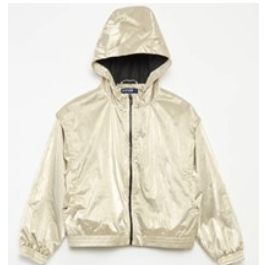 - Coupe vent à capuche métallisé Veste miroitée dorée, à manches longues, capuche non amovible, ouverture complète à l'avant fermée par une fermeture zippée, poche de chaque côté, poignets élastiqués et ourlet. La veste est doublée de tissu noir. Produit vendu en ligne, notamment via Amazon et KIABI.