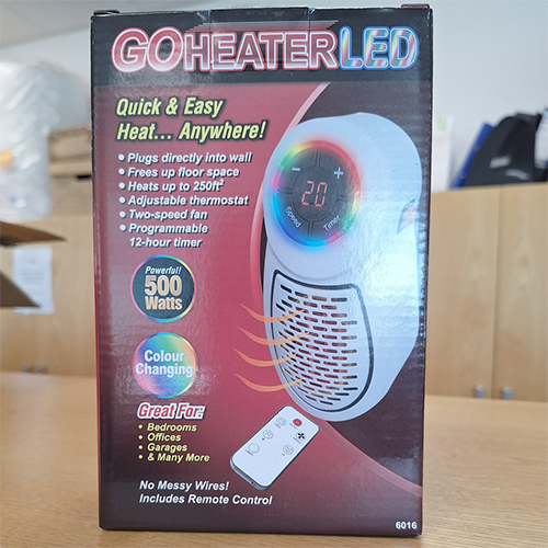 - Go Heater LED Chauffage plug-in blanc avec cadran sur le dessus, une grille blanche à l'avant et un ventilateur d'échappement à l'arrière, vendu avec une télécommande. Produit vendu en ligne, notamment via Amazon (ASIN: B08HJ7QN68)