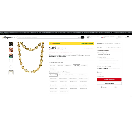 - Colliers en chaîne de grains de café en acier inoxydable Bracelet en métal doré avec des liens en forme de grains de café. Produit vendu en ligne, notamment via AliExpress (identifiant unique: 1005004757541743).