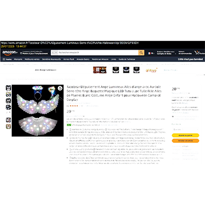 - Déguisement ange lumineux Costume d'ange composé d'une jupe en tulle blanc, d'un bandeau avec un halo de plumes blanches, d'une paire d'ailes en plumes blanches et d'une baguette magique avec une pointe de cœur. Chacune de ces pièces dispose d'un petit compartiment blanc avec des piles bouton pour contrôler le clignotement de nombreuses LED colorées (bleu, rose, vert et blanc). Produit vendu en ligne, notamment via Amazon (ASIN B0BMQF93DY).