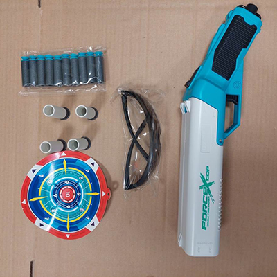 - Soft Bullet Launcher Pistolet à air comprimé en plastique blanc, bleu et noir, avec une paire de lunettes, une cible en carton, quatre obus et dix balles en mousse grise avec ventouses bleues. Produit vendu en ligne, notamment via AliExpress (identifiant unique du produit: 1005009914110938) et Amazon.
